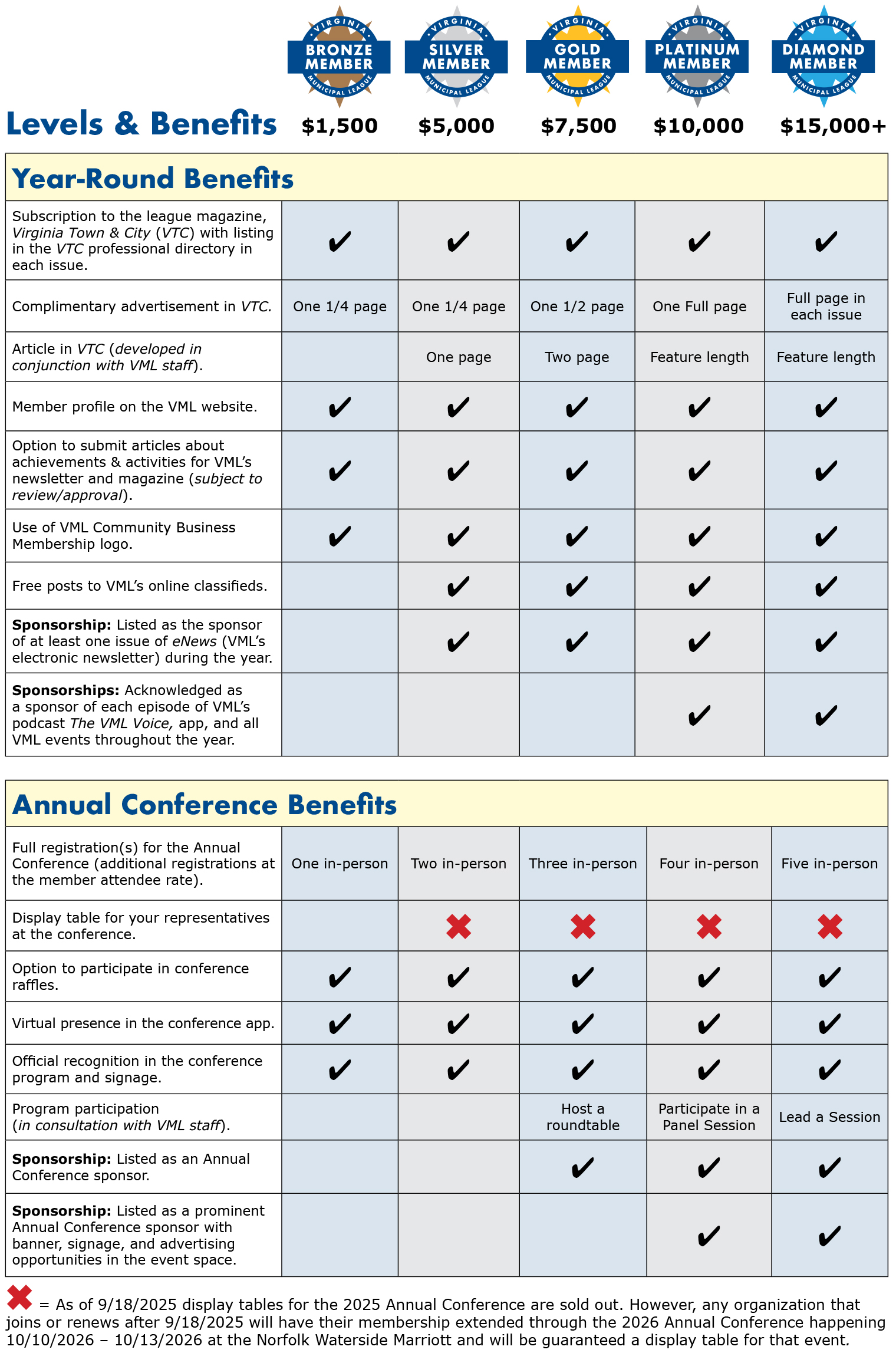 Set your organization apart in the local government marketplace of product, services, and ideas by joining the VML Community Business Membership (CBM) program. As a CBM organization you hold a sustaining membership in VML and keep your firm or organization connected with the issues that are important to municipalities around you. Being a CBM places your organization at the forefront in the minds of VML members, ensuring you the visibility, access, and awareness that will help move your organization forward.