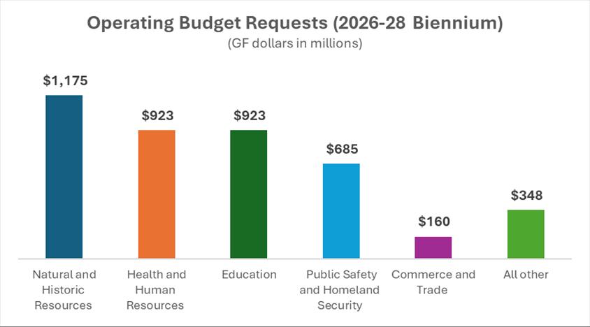The Secretary of Natural and Historic Resources had the most expensive agency budget request at nearly $1.2 billion. Combined, Health and Human Resources and Education – which includes K-12 and higher education – accounted for more than $1.8 billion in budget asks (see table below).