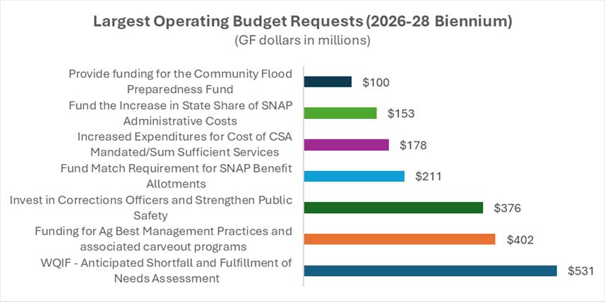 Two requests within the Secretary of Natural and Historic Resources account for nearly $1.0 billion in budget asks as shown below – funding to address a shortfall in the Water Quality Improve Fund ($531 million) and resources for agricultural best management practices ($402 million).